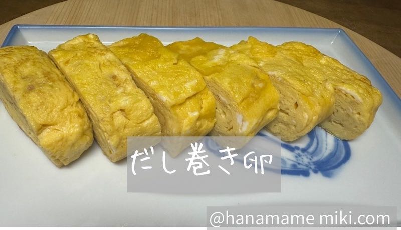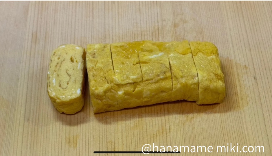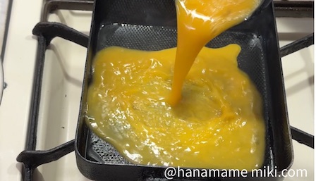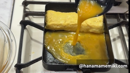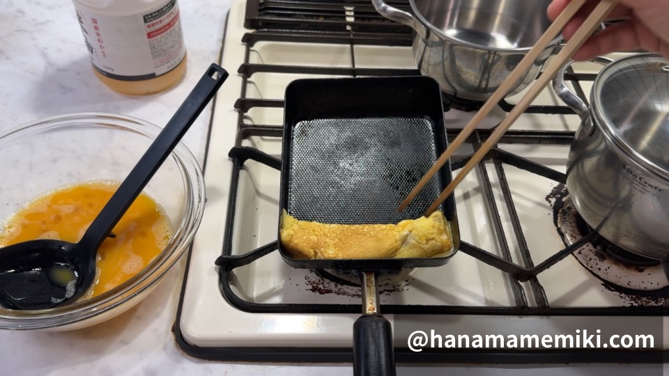 ❸卵焼き器を中火にかけ、油を全体にまわし1/5の卵液を流し、卵を硬めに巻き、同じように卵液を流し繰り返し巻く。