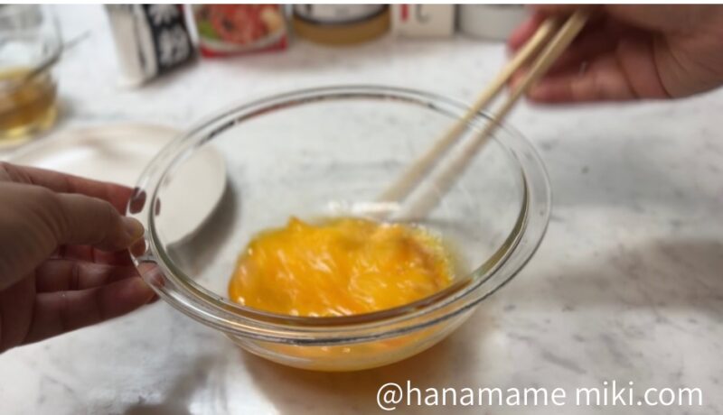 ❶ボウルに卵を割り入れ、菜箸でよく混ぜる。
