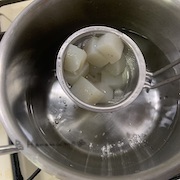 ❷とりきもを熱湯に入れ2分ほど茹でたら、ザルにあげてアクを取り除くように洗う。
