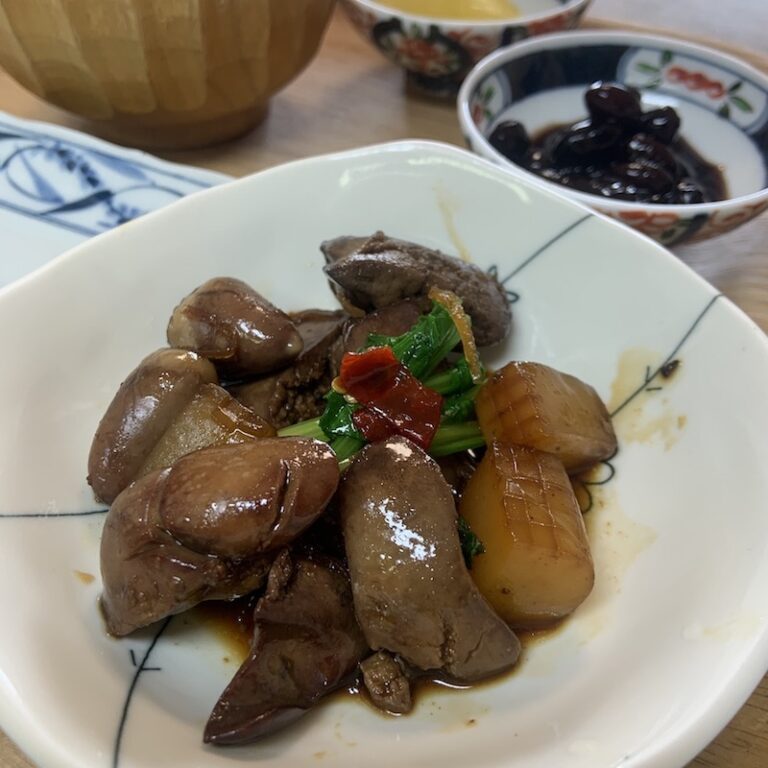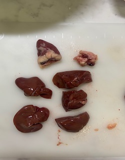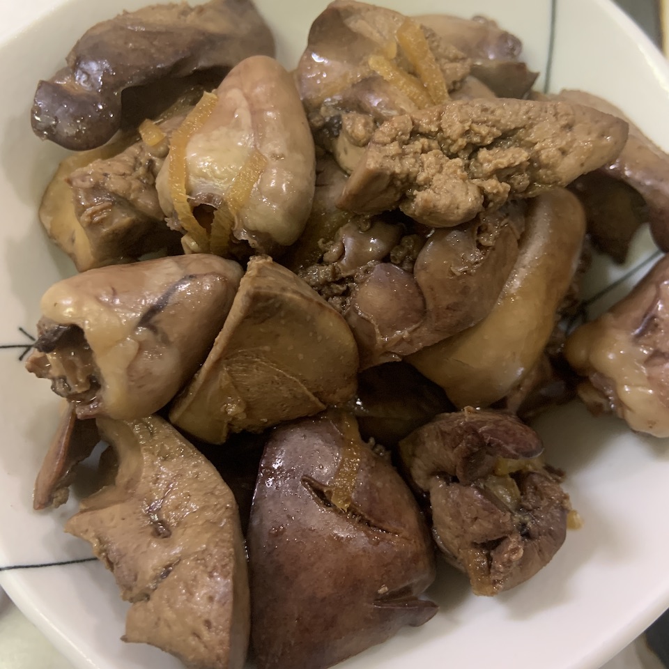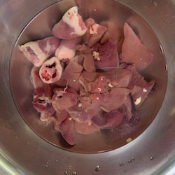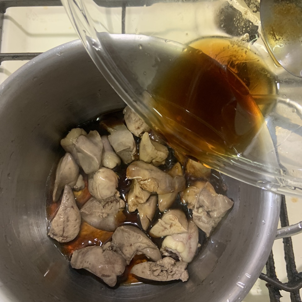 ❶鶏レバー(とりきも)は、はつと肝を切り離し(不要な部分は捨てる)肝の小さい方は2等分大きい方は3等分に切る。切ったとりきもを水にさらし3〜4回水を変えながら、水洗いする。