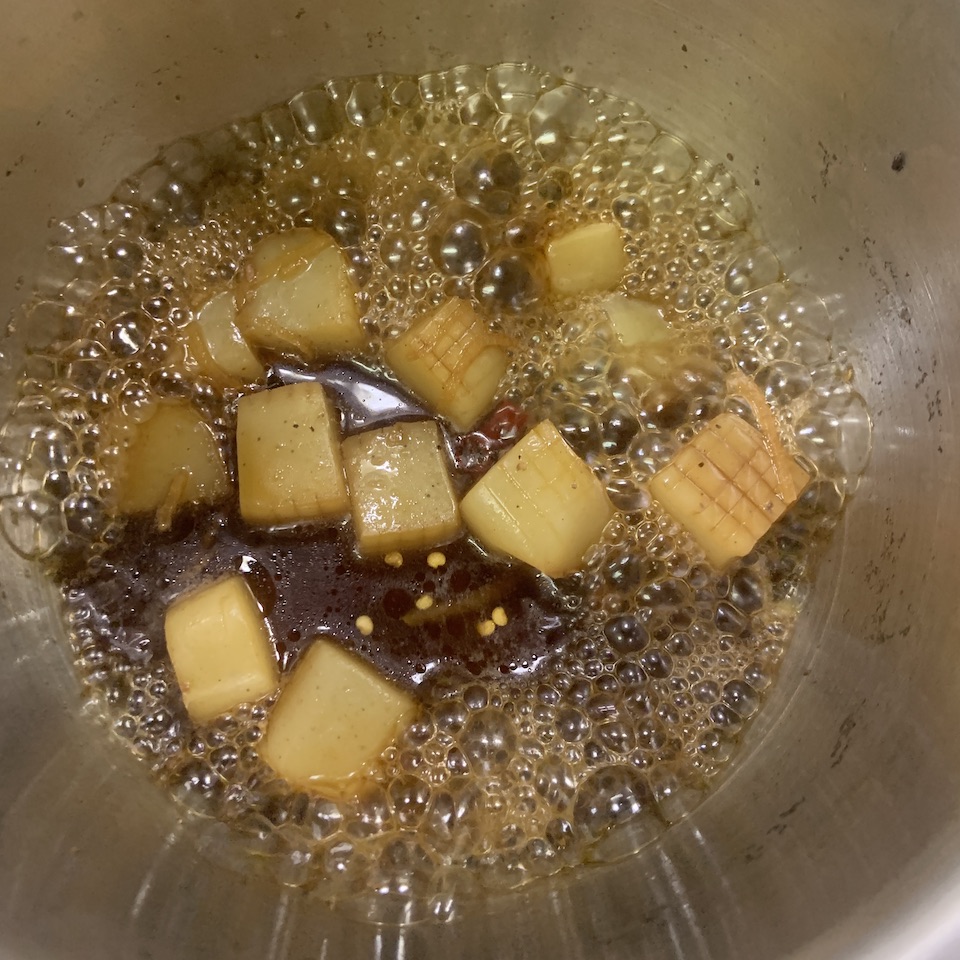 ❺残った煮汁とこんにゃくを煮詰める。煮汁を煮詰めてとろーっとしてきたら、とりきもにかけて完成。